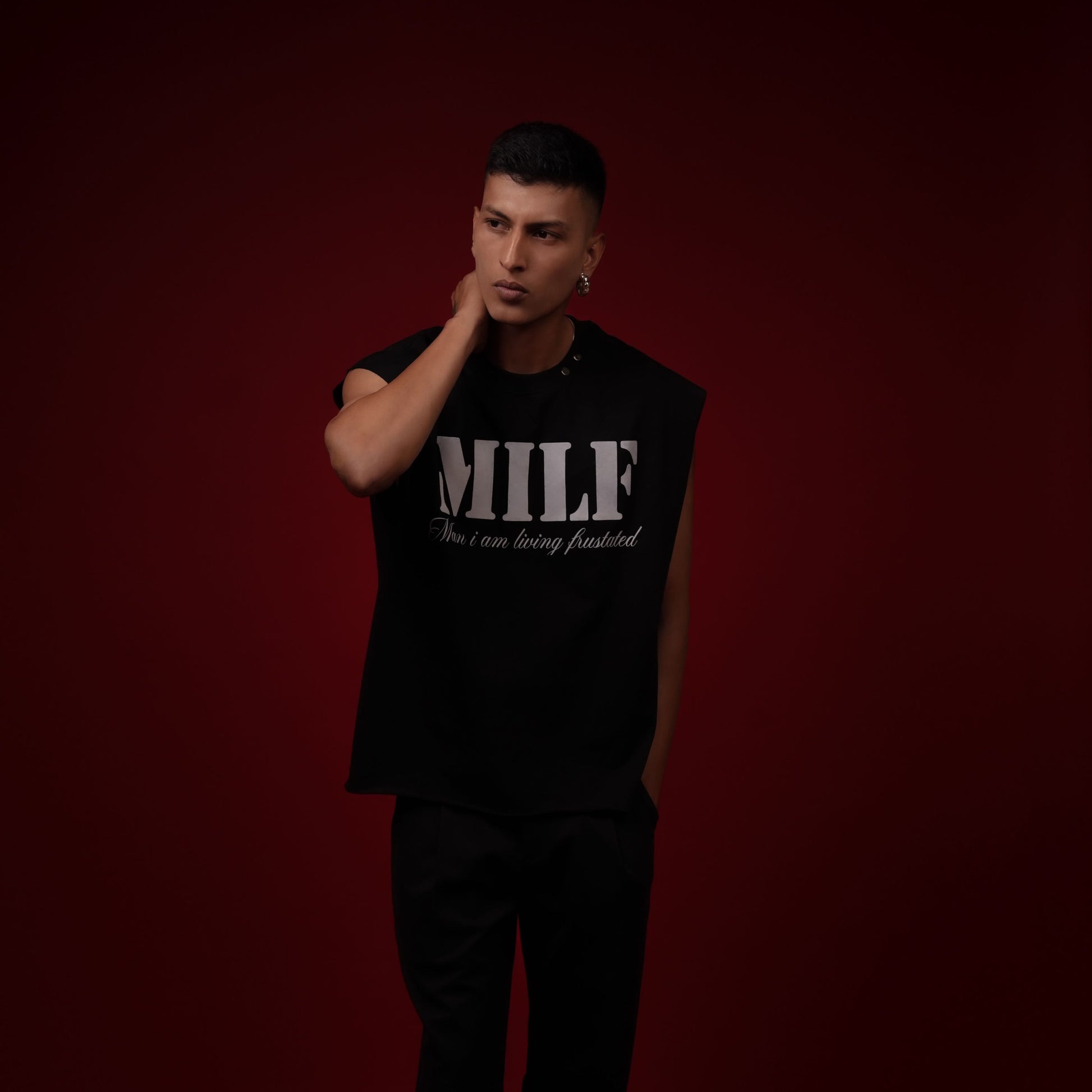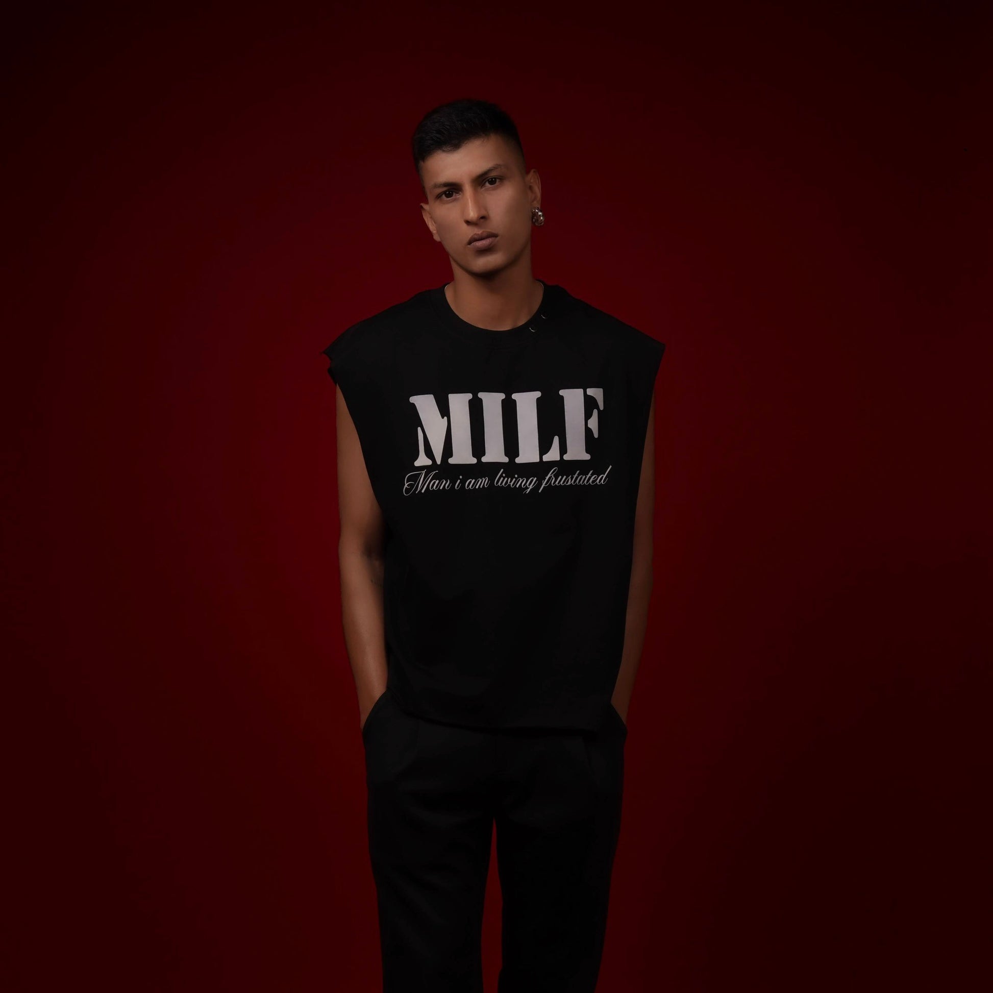 DESIGNED FOR THOSE WHO MOVE UNAPOLOGETICALLY, THIS SLEEVELESS T-SHIRT DELIVERS BOLD ATTITUDE WITH EFFORTLESS CONFIDENCE. THE STRIKING MILF TYPOGRAPHY COMMANDS ATTENTION, WHILE THE SUBTLE SUBTEXT ADDS A SHARP EDGE OF IRONY AND SELF-EXPRESSION — MAKING THIS PIECE IMPOSSIBLE TO IGNORE.